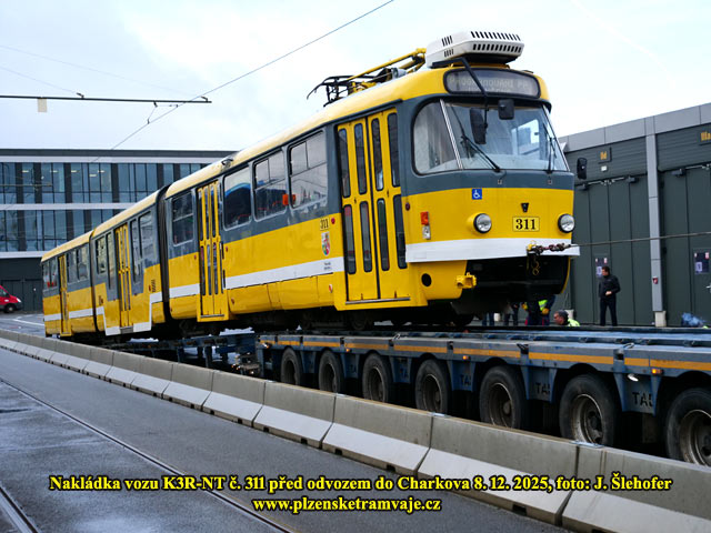 V pondělí 8. 12. 2025 dopoledne probíhala ve vozovně na Slovanech nakládka tramvaje K3R-NT č. 311, která opustí Plzeň a zamíří do Charkova. Pro vůz si přijel ukrajinský dopravce s dlouhým podvalníkem. Po složení rampy byl vůz odbržděn a pomocí navijáku vytažen na podvalník. Další tři vozy K3R-NT jej budou následovat, ale nelze ani odhadnout kdy, může to být i v řádu týdnů. Plzeň pak náklad opustil ve večerních hodinách.