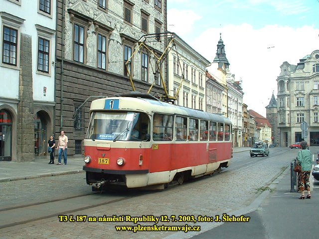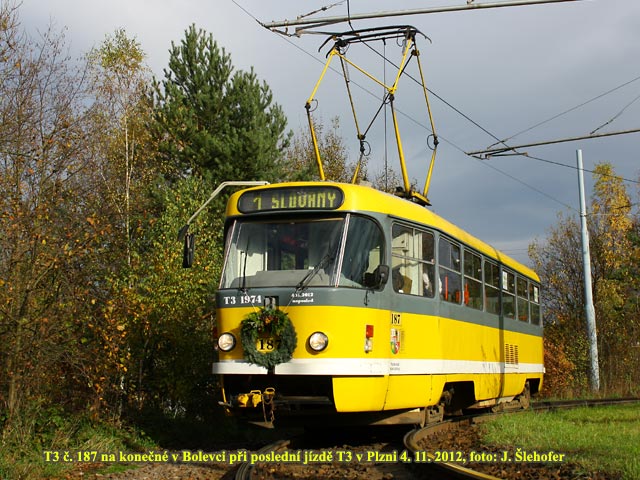 A právě poslední vůz T3 v Plzni v provozu je tak č. 187. Naposledy je do pravidelného provozu vypraven v sobotu 3. 11. 2012 na na linku č. 1. Na čele vozu již s bílým nápisem: "T3 1974 - 4. 11. 2012 naposledy".