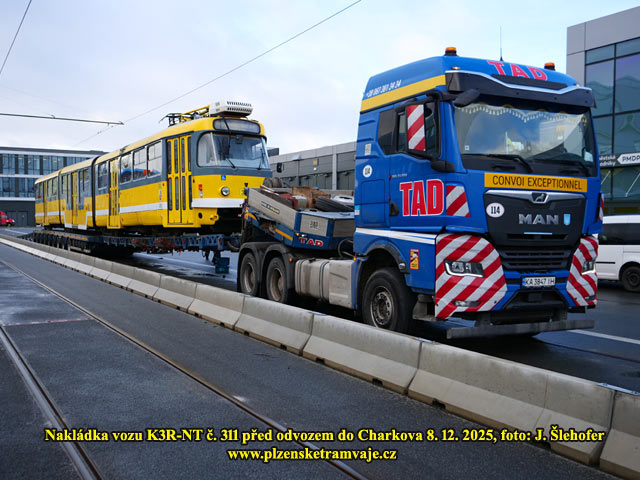 V pondělí 8. 12. 2025 dopoledne probíhala ve vozovně na Slovanech nakládka tramvaje K3R-NT č. 311, která opustí Plzeň a zamíří do Charkova. Pro vůz si přijel ukrajinský dopravce s dlouhým podvalníkem. Po složení rampy byl vůz odbržděn a pomocí navijáku vytažen na podvalník. Další tři vozy K3R-NT jej budou následovat, ale nelze ani odhadnout kdy, může to být i v řádu týdnů. Plzeň pak náklad opustil ve večerních hodinách.