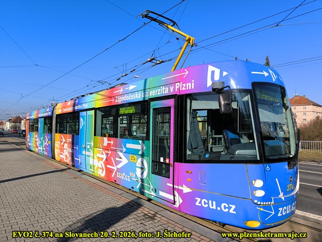 Od 6. 1. 2026 je na voze EVO2 č. 374 nová reklama ZČU. Nedávný pestrobarevný polep Konplan, tak nahradil další pestrobarevný celovozopvý polep.