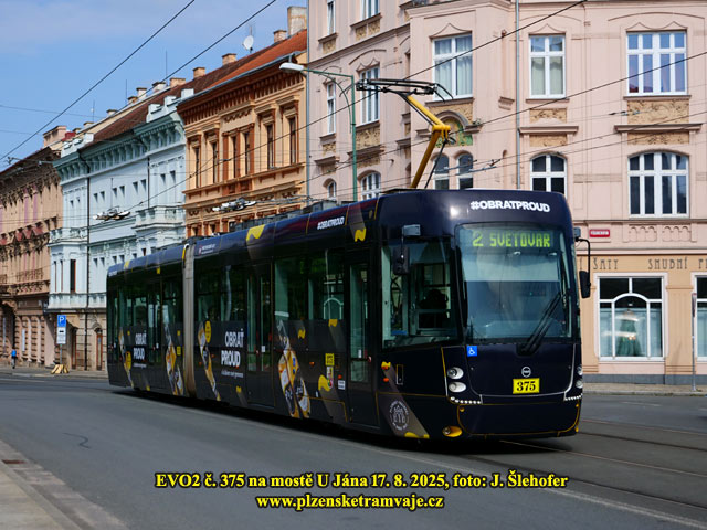 Dne 26. 5. 2025 vyjíždí poprvé vůz č. 375 s reklamou piva Proud. Jak je ze snímku patrné, vůz je převážně v černé barvě.