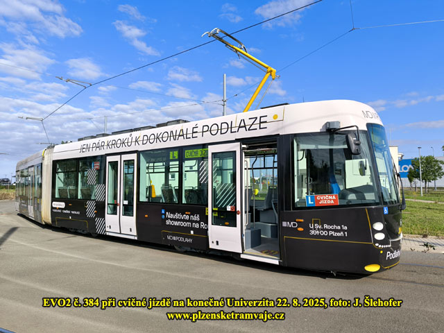 Nová reklama na tramvaji EVO 2 č. 384 je od 30. 8. 2024 v provozu. V převážně černé barvě propaguje MD Podlahy. Na snímku je zachycena při příjezdu k zastávce Majakovského.