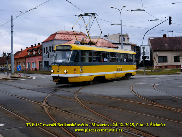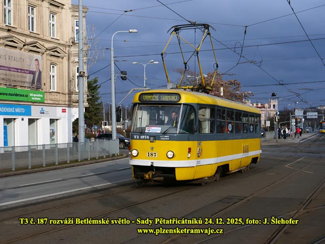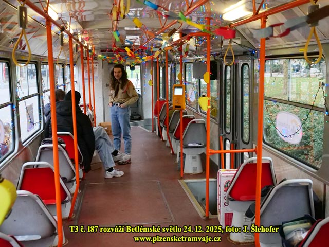 Letos poprvé vypravili skauti ve spolupráci s PMDP tramvaj pro rozvoz Betlémského světla. Dle předem zveřejněného jízdního řádu objížděla 24. 12. 2025 vybraná obratiště, kam si pro plamínek z Betléma mohli zájemci přijít. Vypraven byl historický vůz T3 č. 187, který je zachován ve stavu tak, jak dojezdil v roce 2012.