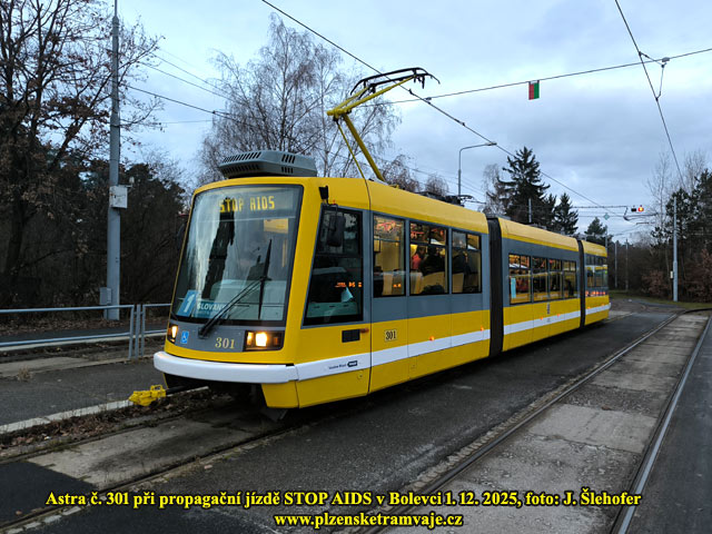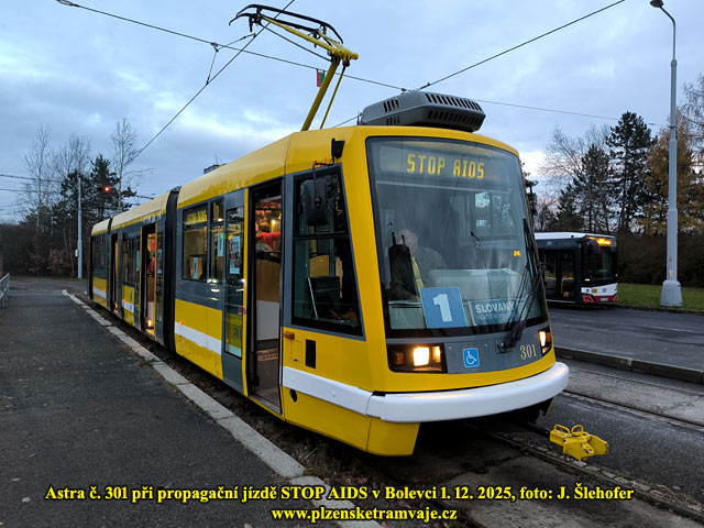 Podobně jako v předchozích letech, také letos vyjela preventivní tramvaj STOP AIDS připojující se k celorepublikové osvětové kampani. Na zvláštní jízdu 1. 12. 2025 byl nasazen již neprovozovaný vůz Astra č. 301 a tak byl vůz vděčným objektem dopravních fotografů. Osvětová tramvaj nabídla cestujícím nejen netradiční jízdu městem, ale také možnost dozvědět se důležité a ověřené informace o prevenci, testování i léčbě HIV.