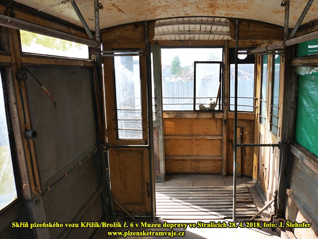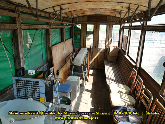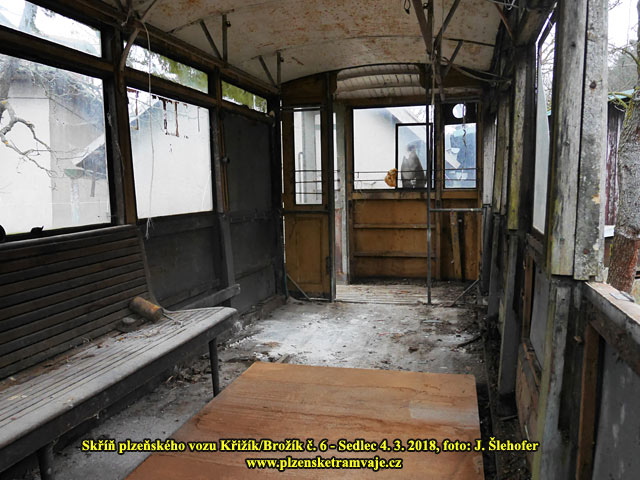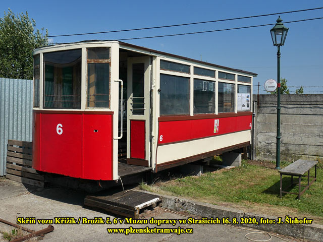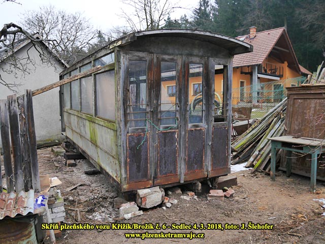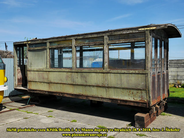 Skříň vozu č. 6 Křižík/Brožík na zahradě v obci Sedlec 4. 3. 2018 Skříň vozu č. 6 Křižík/Brožík na zahradě v obci Sedlec 4. 3. 2018 Vůz byl v roce 1936 přestavěn na vlečný a vyřazen v roce 1957. Následně byla skříň vozu odprodána zaměstnanci, řidiči el. dráhy, což bylo v té době obvyklé a podobný osud mělo více těchto vozů. Vůz sloužil jako kolna při stavbě rodinného domu, později byl používán jako včelín. Při objevení členem Škoda-Bus-Klubu v roce 1997, již sloužil opět jako kolna a odkladiště nářadí, materiálu a všeho nepotřebného. Syn původního majitele se nakonec rozhodl, že tramvaj zlikviduje a v roce 2018 byla tak po dohodě převezena do Strašic.