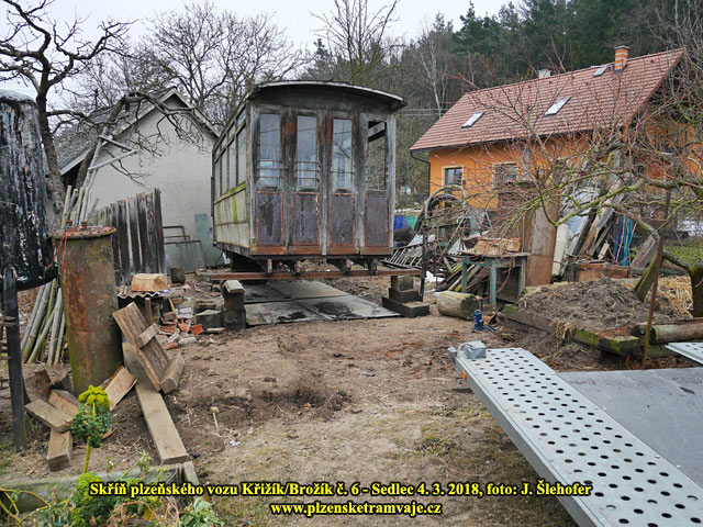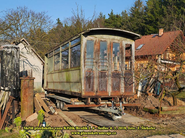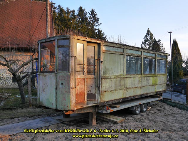 Skříň vozu č. 6 Křižík/Brožík na zahradě v obci Sedlec 4. 3. 2018 Skříň vozu č. 6 Křižík/Brožík na zahradě v obci Sedlec 4. 3. 2018 Jak je ze snímků patrné, skříň má na jedné straně odříznutou plošinu, je tedy zkrácena. K zaslepení jsou pak použity jeho původní dveře, které by jinak byly na boku, jako na opačném konci. Transportu předcházelo několik brigád s přípravou protože skříň byla umístěna na pozemku s ne právě ideálním přístupem.
