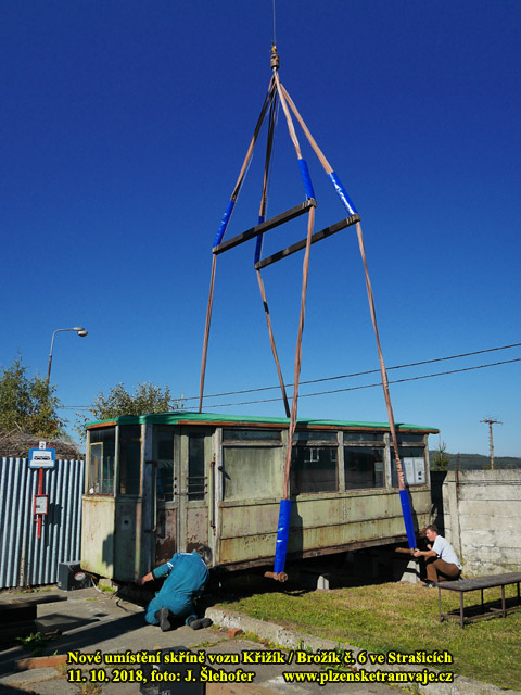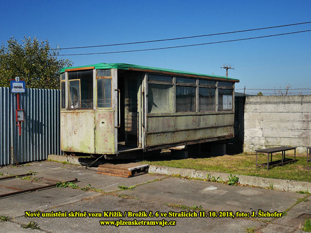 Skříň vozu č. 6 Křižík/Brožík na svém definitivním místě ve Strašicích 11. 10. 2018 Skříň vozu č. 6 Křižík/Brožík na svém definitivním místě ve Strašicích 11. 10. 2018 V říjnu 2018 je skříň vozu postavena podél hradby jako altán, tedy v místě před kolejiště tramvaje T3. Odříznutá plošina je v rohu u hradby a čelem k návštěvníkům tak je zachovalejší druhé čelo. Skříň bude postupně opravována, včetně nátěru, který bude zřejmě odpovídat pozdější době, kdy vůz č. 6 byl již přestavěn a používán jako vlečný.