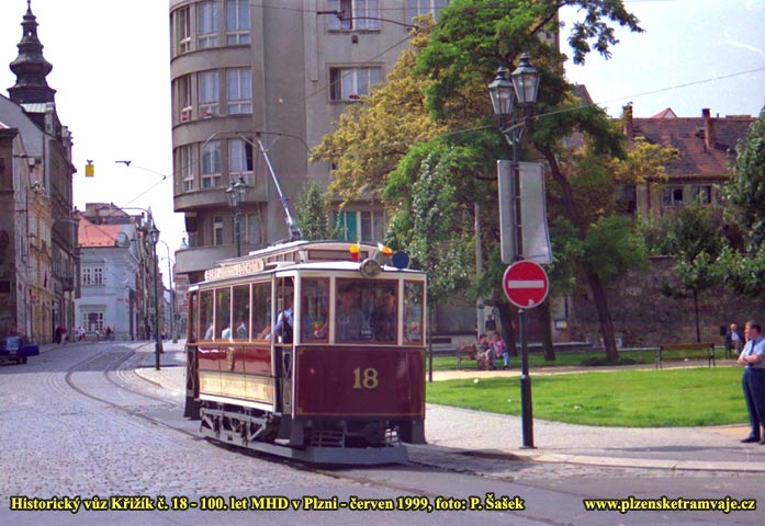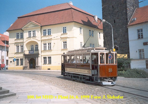 Největším lákadlem byl vůz č.18 z roku 1899, který je nejstarší v ČR. Na první fotografii (nahoře) ho můžeme vidět na nástupní stanici brzo po ránu, kdy před ním ještě nestály fronty lidí. Trasa této tramvaje byla sice nejkratší, ale díky velkému zájmu o ní a také proto, že má jen 18 míst k sezení, se na ní stály fronty. Její trasa vedla přes náměstí Republiky na Palackého náměstí a zpátky. Na druhé fotografii projíždí zrovna Pražskou ulicí, pod vodárenskou věží.