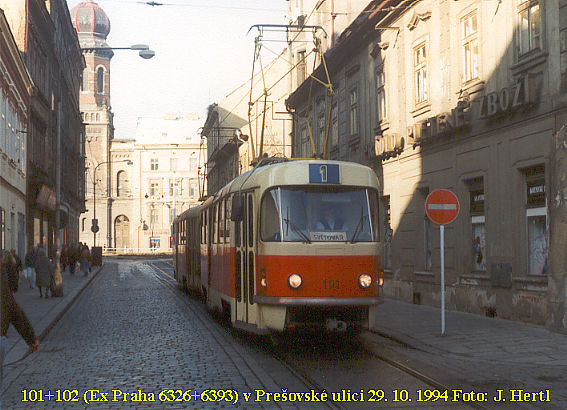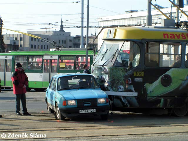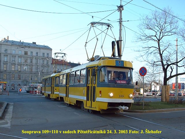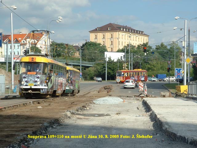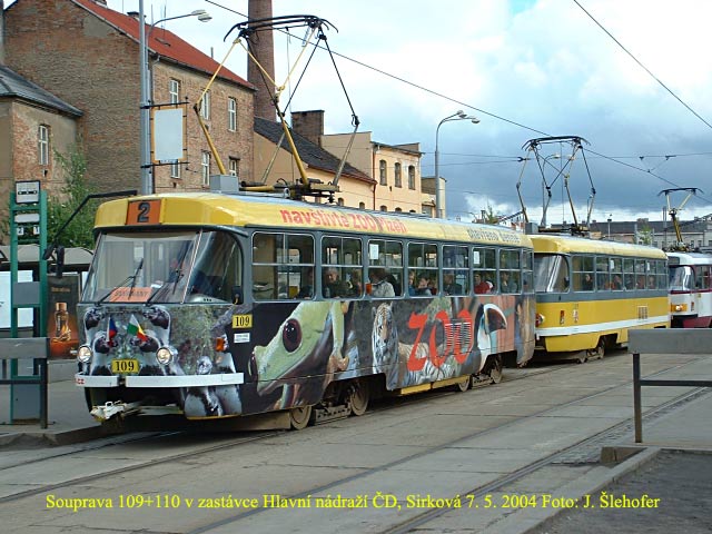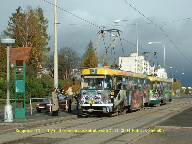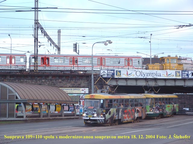 Souprava 109+110 spolu s modernizovanou soupravou metra 18. 12. 2004 Souprava 109+110 nezvykle na lince č. 4 v zastávce Sokolovská 7. 11. 2004 Souprava 109+110 při nehodě v křižovatce Sirková - Americká 7. 3. 2005
