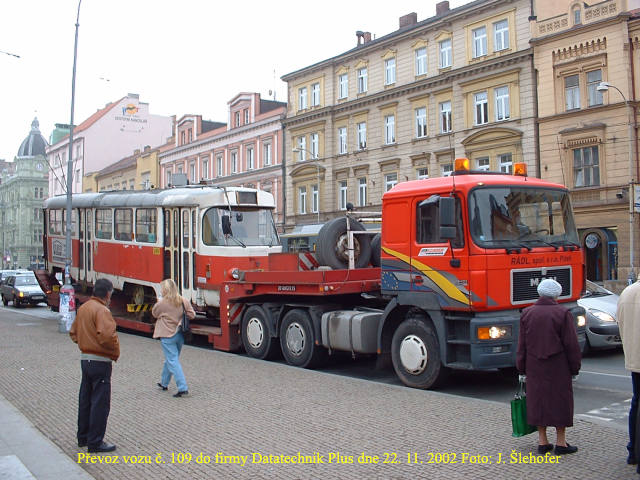 Převoz vozu 109 do dílen firmy Datatechnik Plus  Souprava 109+110 ještě v červeném nátěru na lince č. 5 Foto: M. Klas V Plzni sloužila souprava 109+110 zejména na lince č. 2, pravidelně také bývala nasazóvána na linku č. 5. Koncem roku 2002 odchází ještě v červeném nátěru na velkou prohlídku do firmy Datatechnik Plus. Do té doby byl její osud už značně nejistý, neboť stála dlohodobě odstavená a velmi vážně se uvažovalo o jejím sešrotování.