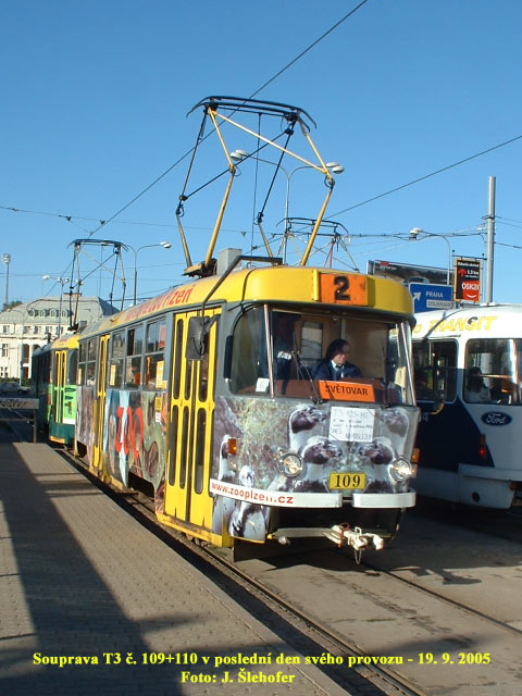 Souprava 109+110 na Koterovské třídě v poslední den svého provozu 19. 9. 2005 Souprava 109+110 přijíždí do zastávky Hlavní nádraží Českých drah, Sirková v poslední den svého provozu 19. 9. 2005 Pondělí 19. 9. 2005 byl posledním provozním dnem soupravy T3 č. 109+110. Čeká jí stejný osud jako soupravu vozů T3 č. 101+102. Obě budou přestavěny ve firmě Pars nova a. s. na velkokapacitní částečně nízkopodlažní tramvaje K3R-NT podobné vozům K3RN v Brně. Vozy č. 109+110 jsou v provozu s cestujícími od konce roku 1996. Před svou cestou do Plzně již sloužily pod čísly 267 a 270 v DP Mostu a Litvínova. Zde byly v místních dílnách v roce 1976 přestavěny z původních vozů T2.