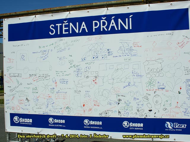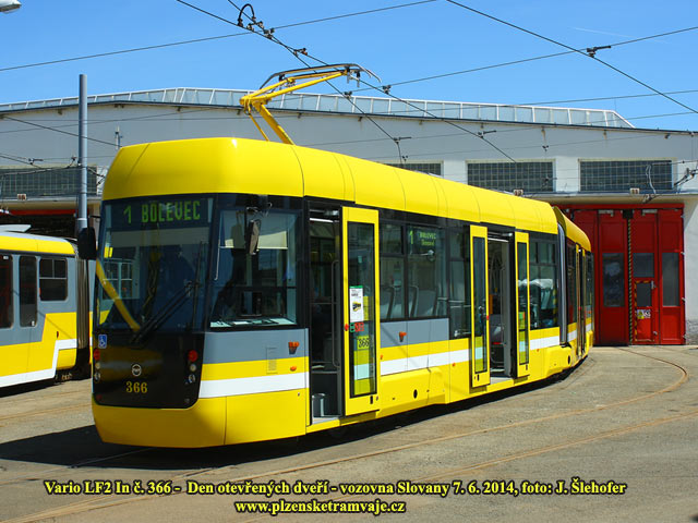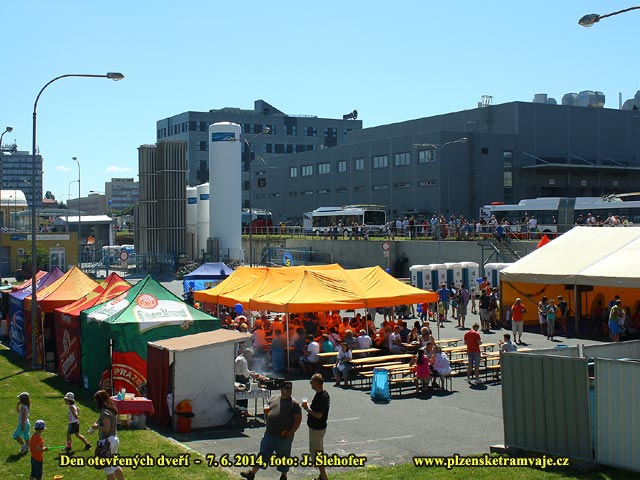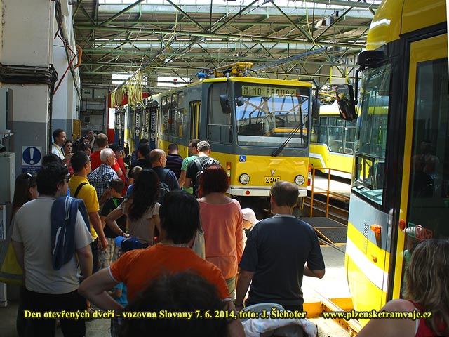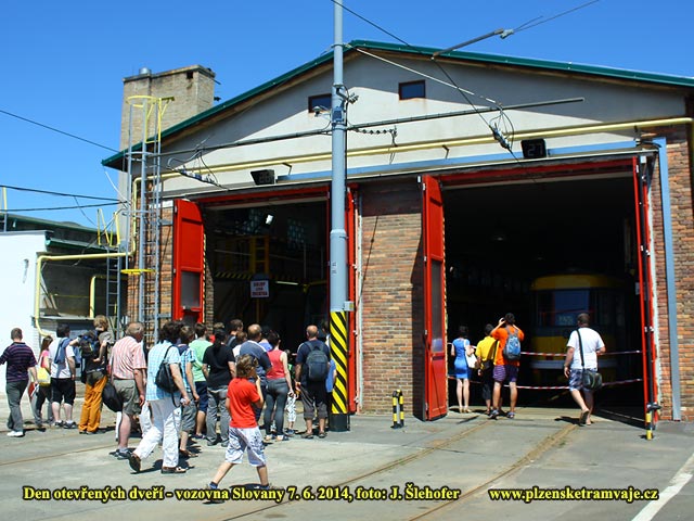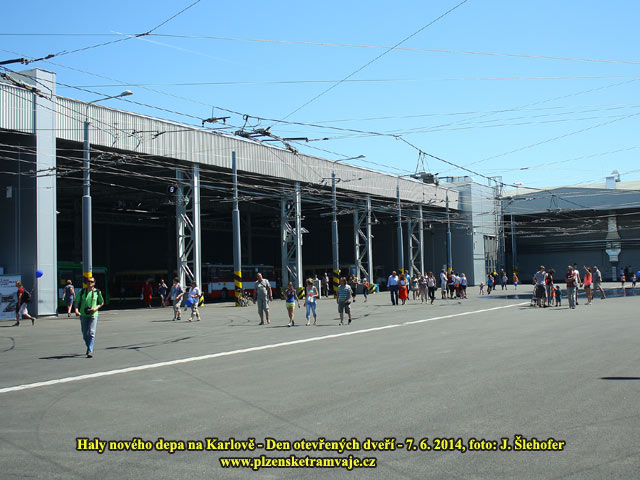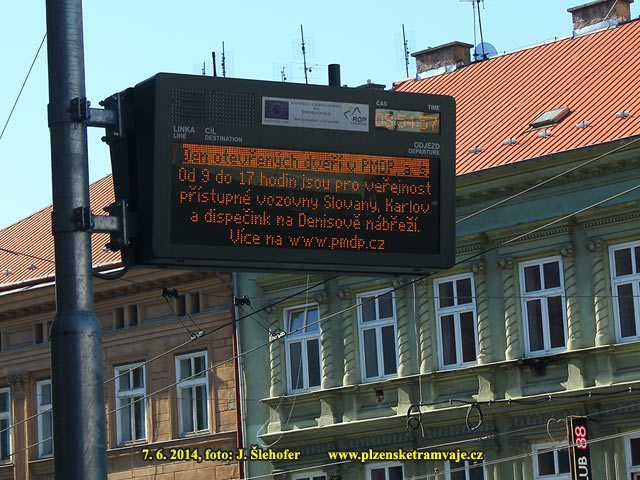 Inteligentní zastávka zvoucí na den otevřených dveří 7. 6. 2014 V sobotu 7. 6. 2014 připravily Plzeňské městské dopravní podniky den otevřených dveří. Veřejnosti se tak otevřela opět tramvajová vozovna Slovany, dispečink v hlavní budově na Denisovo nábřeží a letos poprvé nové depo na Karlově. Ve stejný den otevřela své brány také s areálem sousedící Škoda Transportation.