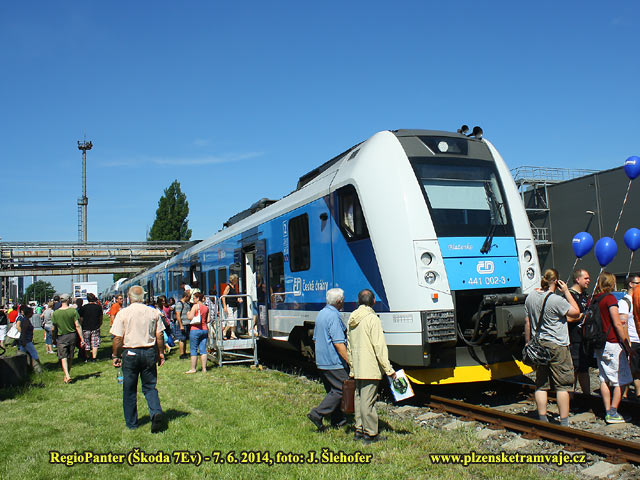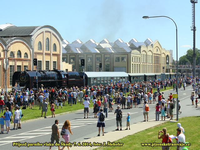 Regiopanter - Den otevřených dveří 7. 6. 2014 Příjezd parního vlaku do areálu Škoda 7. 6. 2014 Velkým lákadlem pro návštěvníky nejen z Plzně byl pak den otevřených dveří v sousedním areálu výrobce Škody Transportation. Vystaveny zde byly elektrické jednotky, i lokomotivy. Dopoledne pak do areálu přijel z Prahy vlak tažený parní lokomotivou. V té době se zde asi sešlo nejvíce návštěvníků.