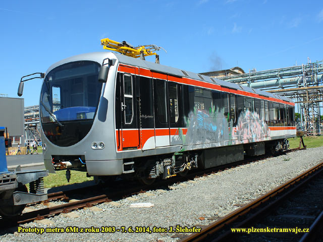 Den otevřených dveří - prototyp vozu metra 6mt - 7. 6. 2014 Den otevřených dveří - 26T č. 607 pro Miskolc - 7. 6. 2014 Vděčnými objekty fotografů byly také tyto dva stroje, i když nešlo právě o vystavované exponáty. Vlevo je prototyp vozu metra 6mt z roku 2003, který zde stál v areálu odstavený. Vpravo je pak 26T č. 607 pro Miskolc, již naložená před expedicí k zákazníkovi. Vlastně šlo o jedinou, pro focení téměř ideálně nasvícenou tramvaj.