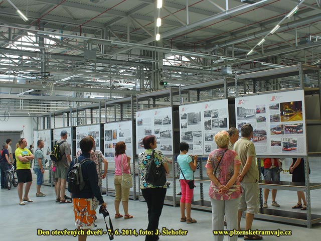 Den otevřených dveří - hala kontrolních prohlídek 7. 6. 2014 Den otevřených dveří - výklad ve vozovně 7. 6. 2014 Každou celou hodinu procházela pak vozovnou prohlídka s průvodcem. Návštěvnící nahlédli do haly KP, tu pak obešli do zadní části areálu, kde je složen materiál pro údržbu kolejí i různé další náhradní díly. Tzv. "novou" halou pak pokračovala prohlídka zpět k vystaveným vozům.