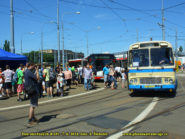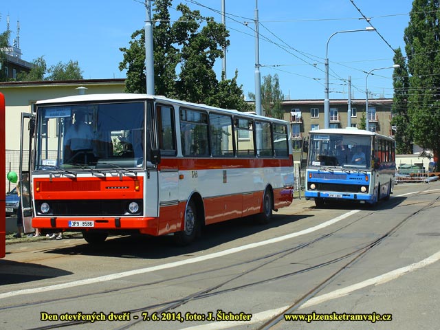 Den otevřených dveří - pražský autobus Škoda 706 RO na Karlově - 7. 6. 2014 Den otevřených dveří - pražský autobus ŠM 11 - vozovna Slovany - 7. 6. 2014 Do vozovny Slovany přivážela návštěvníky zvláštní autobusová linka oznašená S, na které byly nasazeny kloubové Solarisy. Druhá linka označená K pak navážela návštěvníky na Karlov. Oba areály pak spojovala lika H, na které byly nasazeny historické autobusy. Interval na všech linkách byl 20 minut. Den otevřených dveří - ŠL Škoda Bus klubu 7. 6. 2014 Den otevřených dveří - Karosy na Slovanech 7. 6. 2014 Na lince H jezdily autobusy ve třech párech. Spolu tak jezdily z Prahy zapůjčené autobusy Škoda 706 RO a Karosa ŠM 11, na dalším pořadí pak červená Karosa B 731 PMDP spolu s modrou Karosou C734 Škoda Bus klubu. Třetím párem pak byly vozy Škoda Bus klubu a to Karosa ŠL 11 a Škoda 21Ab.