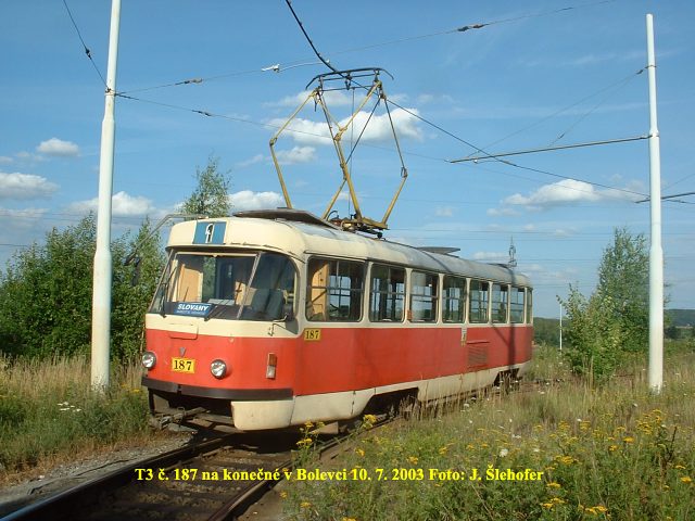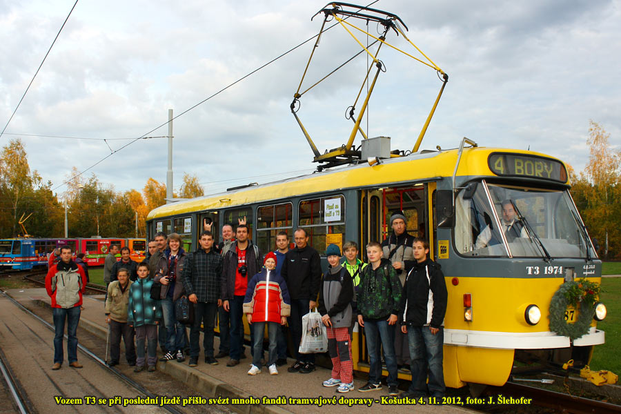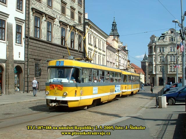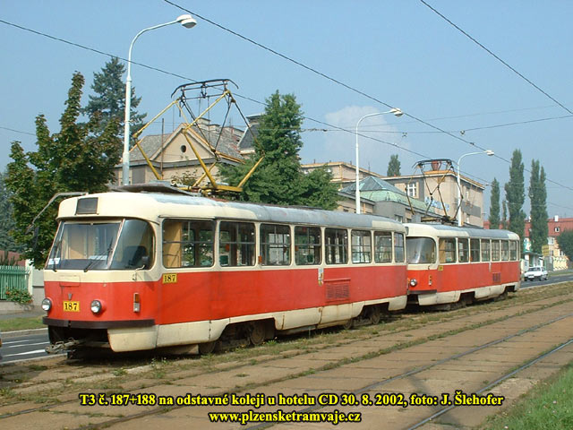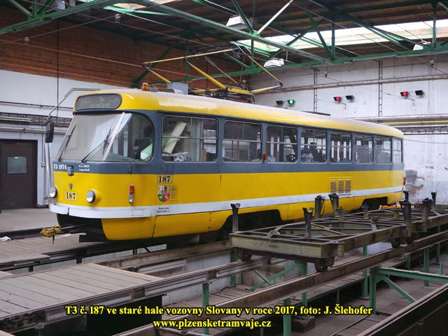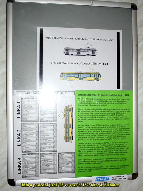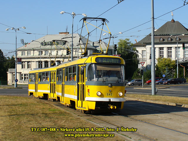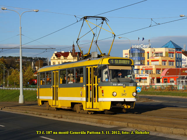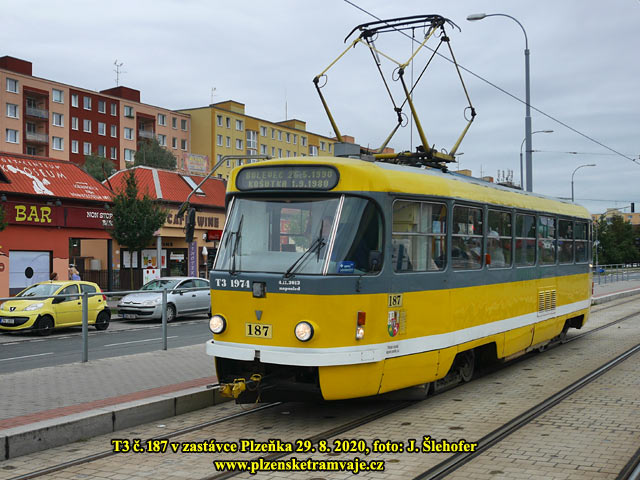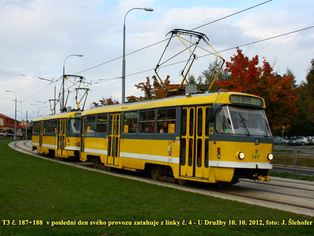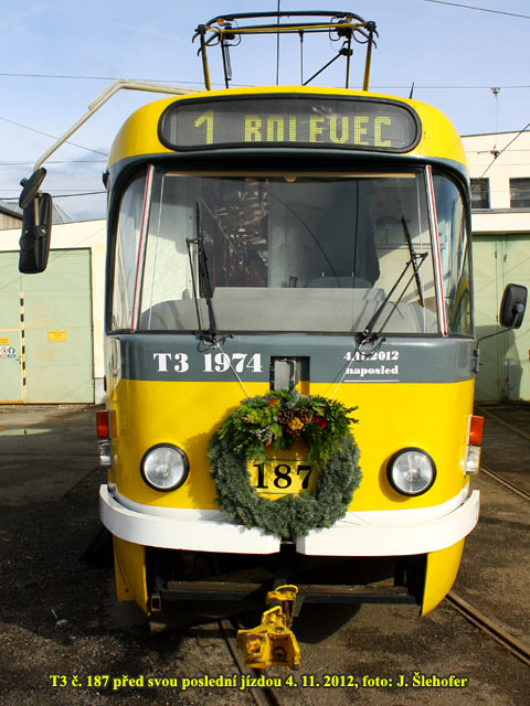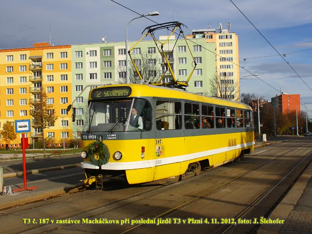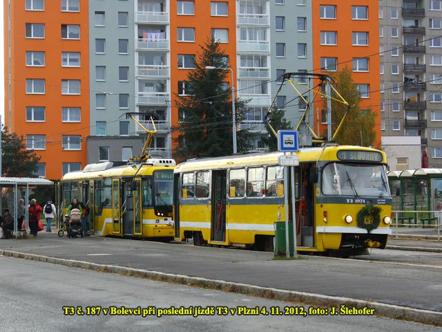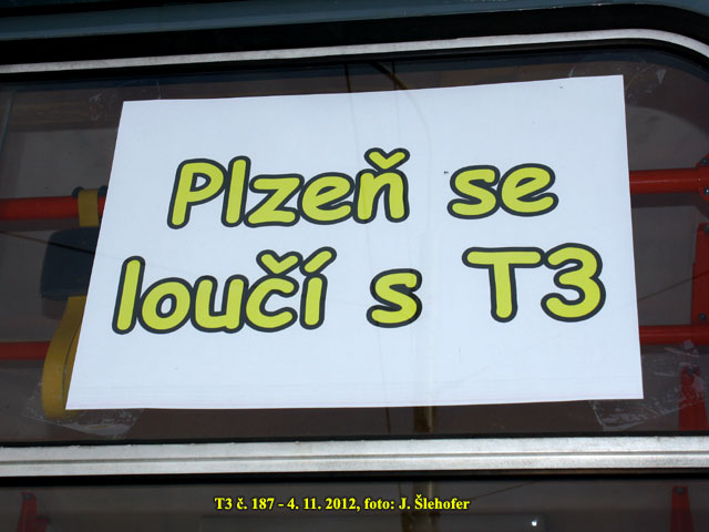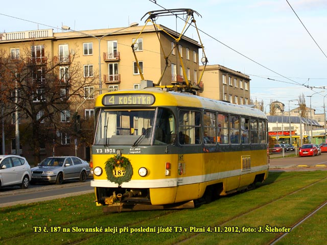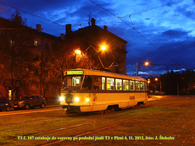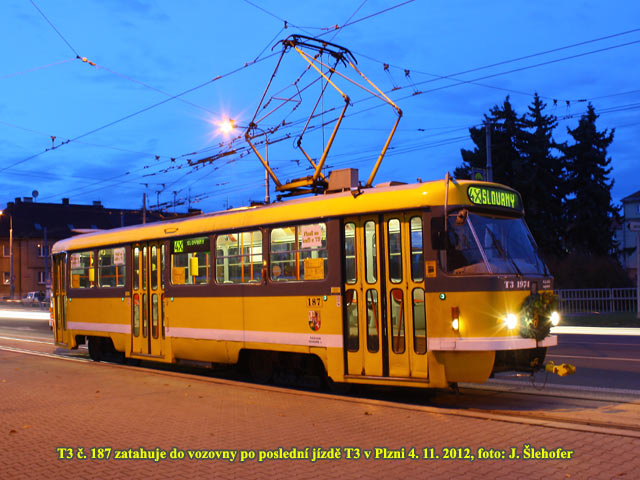 A právě poslední vůz T3 v Plzni v provozu je tak č. 187. Naposledy je do pravidelného provozu vypraven v sobotu 3. 11. 2012 na na linku č. 1. Na čele vozu již s bílým nápisem: "T3 1974 - 4. 11. 2012 naposledy".