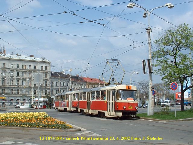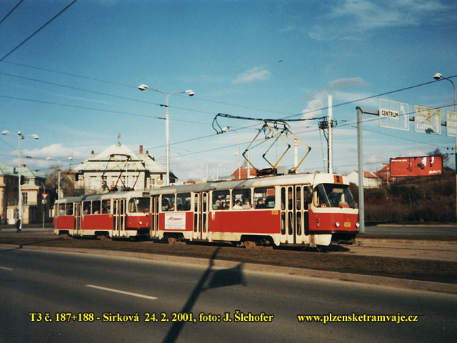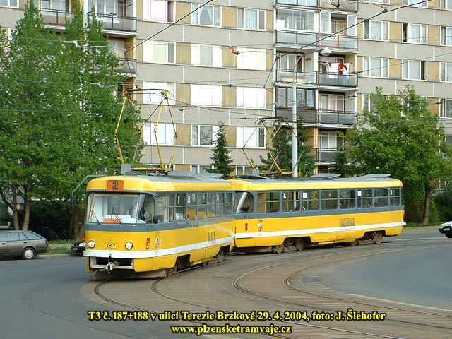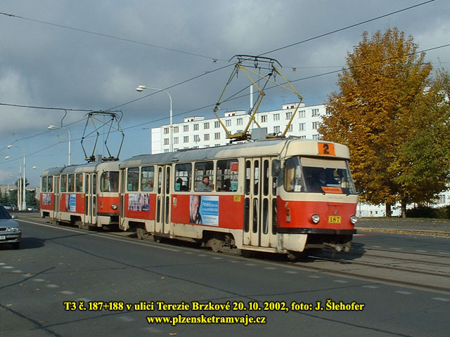 Mnozí soupravu 187+188 můžeme pamatovat ještě v červeném nátěru, neboť šlo o jednu z posledních souprav, která v této podobě v Plzni jezdila.