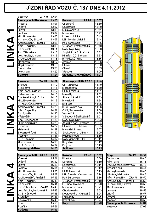 linka č. 2 do Skvrňan. Jízdní řád byl udělán, tak že vůz č. 187 vždy půlil čas mezi běžnými spoji. Na konečných nechybělo samozřejmě focení.