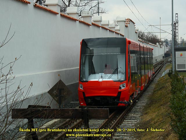 Tramvaj 30T pro Bratislavu odpočívá na zkušební koleji u výrobce 28. 2. 2015 Tramvaje mají čtyři podvozky, při čemž oba krajní jsou otočné a mezi nimi jsou ještě dva pevné. Jde tedy o zajímavé uspořádání, kdy krajní otočné podvozky by mohly zvýšit jízdní komfort vozů v obloucích (pří nájezdu vozů do oblouku) oproti vozům se všemi pevnými podvozky. Po zkušenostech jízdou s vozy 26T pro Miskolc, které mají výrazně lepší jízdní vlastnosti (jsou tižší), oproti předchozí generaci vozů podobných 14T, by tramvaje 29T a 30T mohly být zajímavými vozidly. Sám jsem byl tedy velmi zvědav na jejich jízdní vlastnosti.