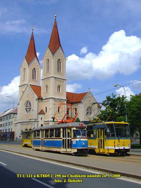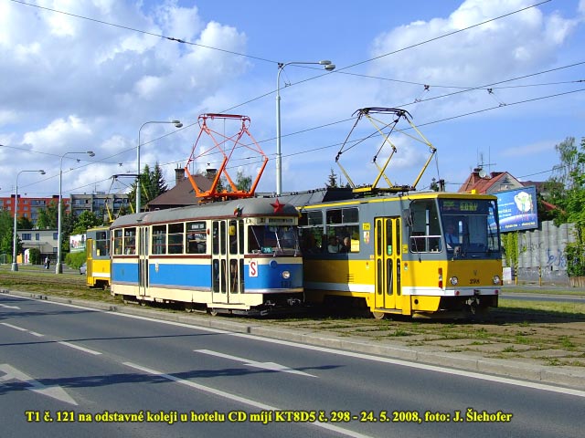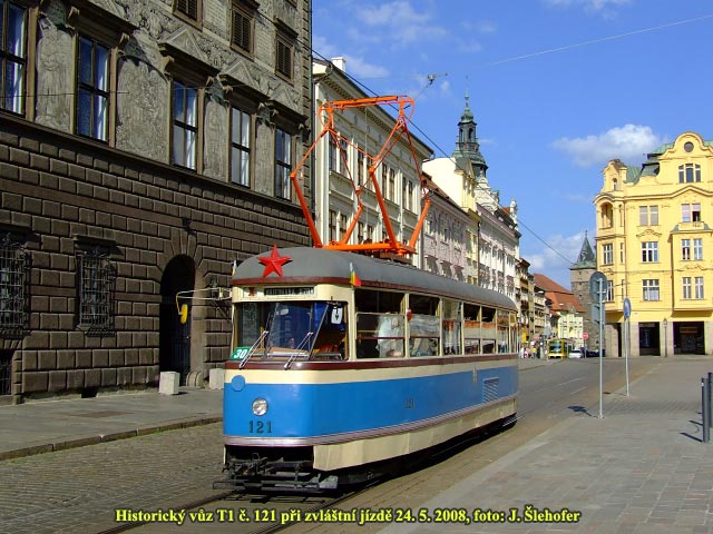 foto: V. Leška T1 č. 121 na odstavné koleji u hotelu CD spolu s vozem KT8D5 č. 298 - 24. 5. 2008 T1 č. 121 před plzeňskou radnicí - 24. 5. 2008 Interiér vozu T1 při objednané jízdě 24. 5. 2008,