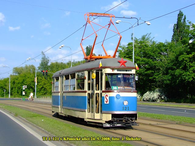 foto: M. Kratochvíl T1 č. 121 míří Křimickou ulicí do Skvrňan - 24. 5. 2008 T1 v zastávce Macháčkova 24. 5. 2008 T1 v Palackého ulici 24. 5. 2008 T1 míří ze Světovaru k vozovně 24. 5. 2008