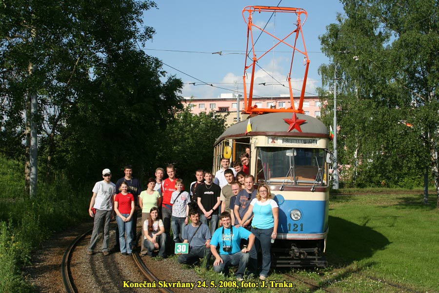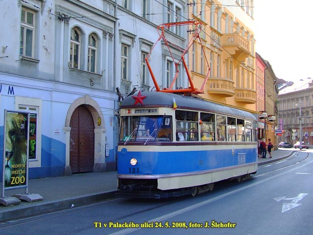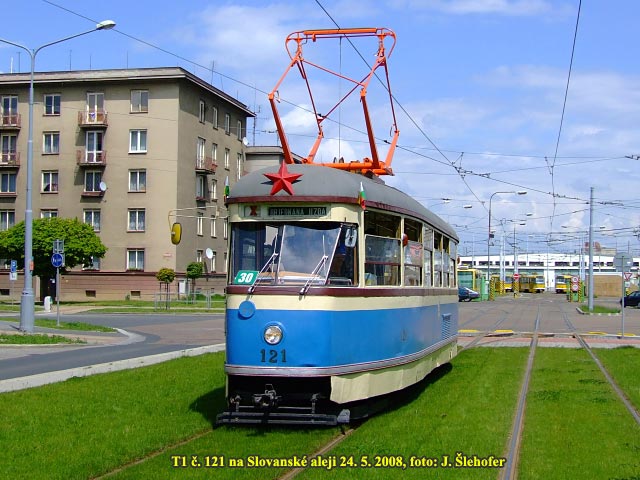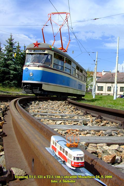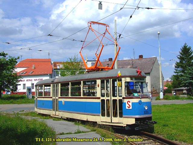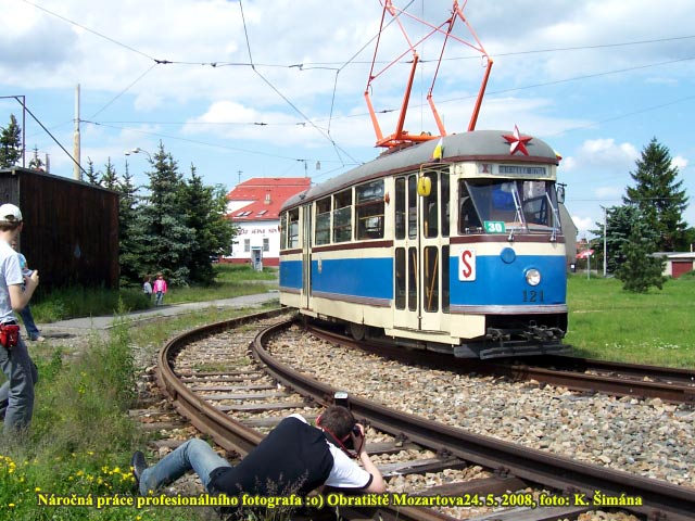 foto: V. Leška T1 č. 121 spolu s T2 č. 146 v obratišti Mozartova 24. 5. 2008 Náročná práce nejmenovaného fotografa nejmenovaného deníku 24. 5. 2008,