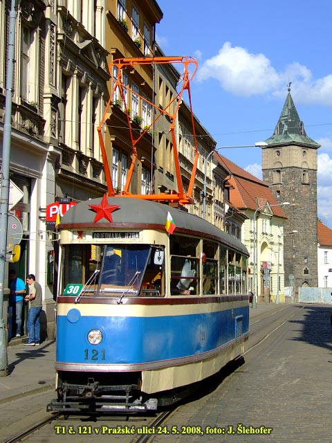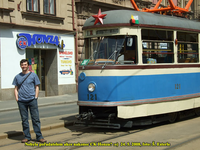 foto: Š. Esterle V sobotu 24. 5. 2008 tak vyrazil objednaný historický vůz T1 č. 121 na projížďku městem. Přesto, že v předcházejících dnech bylo spíše deštivo, sobotní počasí se vydařilo. Občas sice slunce zalezlo za mrak (např. když jsme si fotili T1 s divadlem J. K. Tyla), ale většinou nám štěstí přálo.