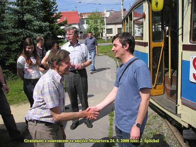 Gratulanti s oslavencem v obratišti Mozartova 24. 5. 2008,
