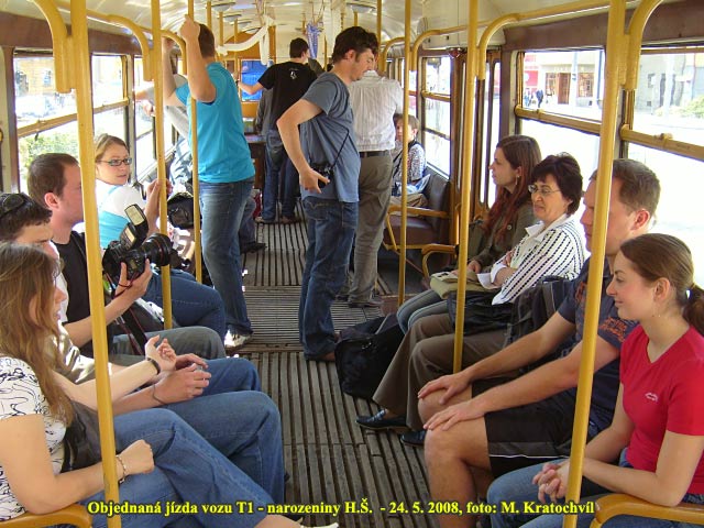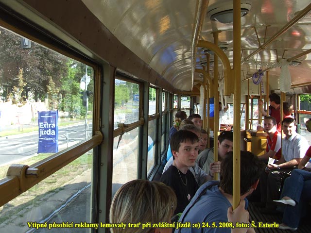 T1 č. 121 při objednané jízdě míjí na Chodském náměstí KT8D5 č. 298 s (díky výluce) netypicky zvednutými oběma sběrači - 24. 5. 2008 Podél trati vtipně působící reklamy a osazenstvo vozu T1 - 24. 5. 2008, foto: Š. Esterle Vzhledem k tomu, že osazenstvo tvořily zejména lidé s kladným vztahem k tramvajím či MHD, nechyběly plánované i operativní fotozastávky, samozřejmě s ohledem na bezpečnost a tak, aby nebyla zdržována pravidelná tramvajová doprava. To však se současnými dlouhými víkendovými intervaly nebyl zase takový problém.