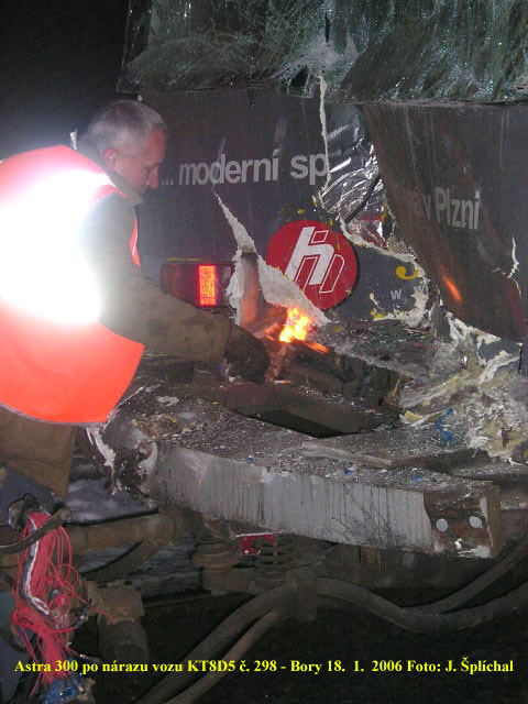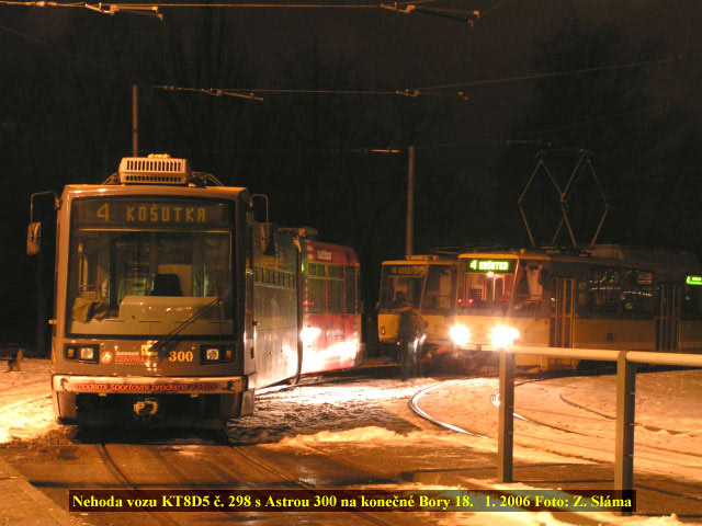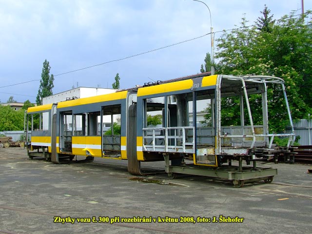 V roce 2004 byl vůz na úpravách u výrobce, kde dostal (stejně jako ostatní Astry) nový brzdový systém Dako. Při té příležitosti byly vyměny některé plechy a vůz dostal také obvyklý žlutošedý lak. S novými brzdami jezdil zřejmě o něco spolehlivěji. Dokonce dostal v září 2005 další celovozovou reklamu na prodejnu sportovních potřeb Hannah. Jako cestující si však např. pamatuji na nepříjemné vrzání a praskání, které se ozývalo z kloubu v obloucích. Tramvaj tak byla vhodná zejména pro rovnou linku č. 4. Zde také dojezdila osudný večer 18. 1. 2006. Na konečné Bory došlo k nehodě, kdy do stojící Astry č 300 narazil vůz KT8D5 č. 298. Od té doby byla "třístovka" odstavena a čekala téměř dva roky na dodání nového čela od výrobce. Už se jej nedočkala, neboť na podzim 2007 bylo rozhodnuto o vyřazení vozu i vzhledem k jeho atypičnosti. Objednané zadní čelo bylo tak použito na vůz č. 307, který byl mezi tím rovněž nabourán. Vůz byl postupně odstrojen a všechny použitelné díly byly uschovány na případné opravy ostatních Aster. Následuje výběr fotografií ze života tohoto vozu.