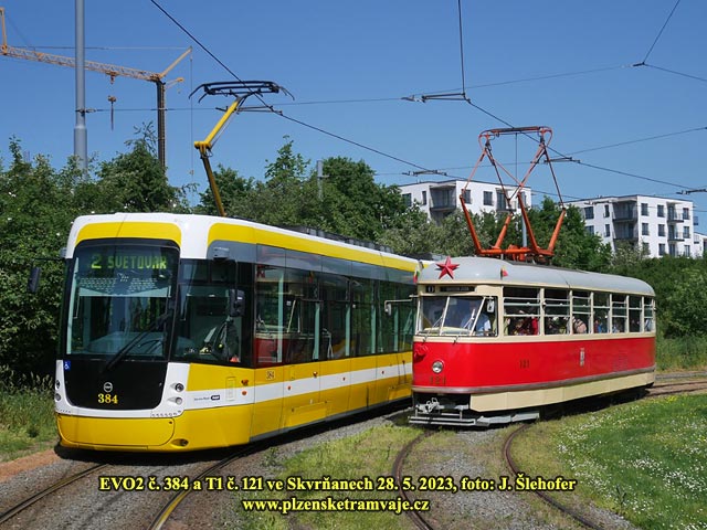 Vraťme se tedy k nedělním oslavám. Na snímku vpravo, pořízeném na konečné Skvrňany je zachycena tramvaj EVO2 č. 384 (které jsou na linku č. 2 vypravovány o víkendech) a