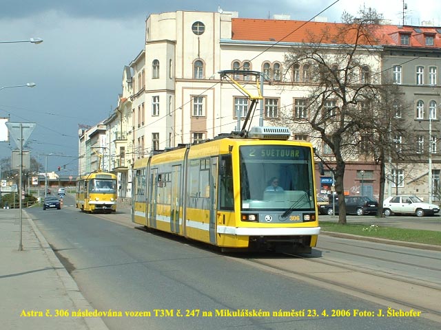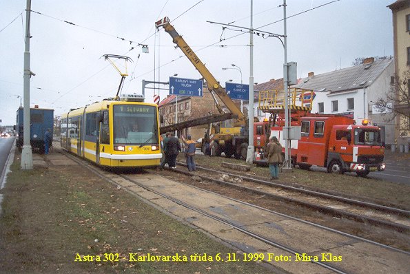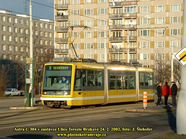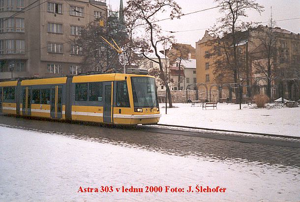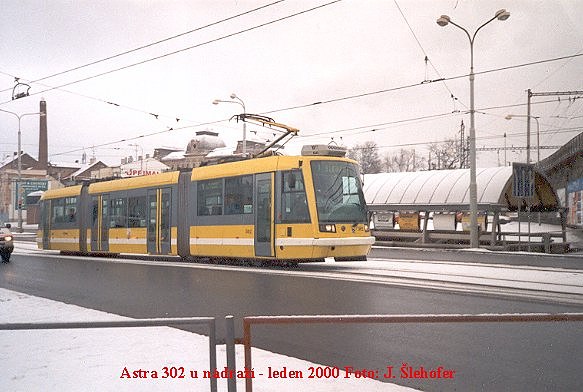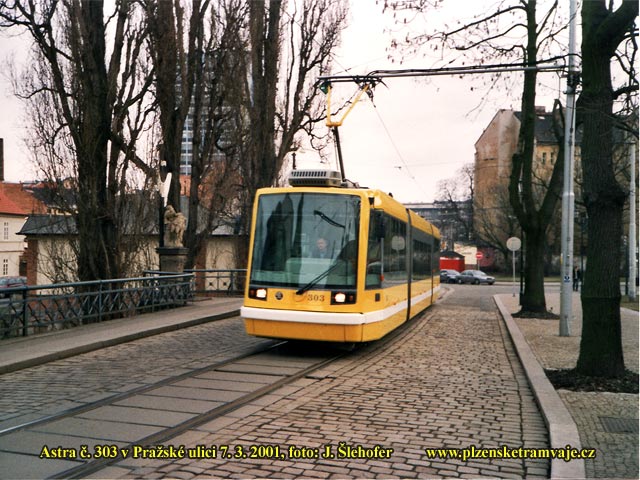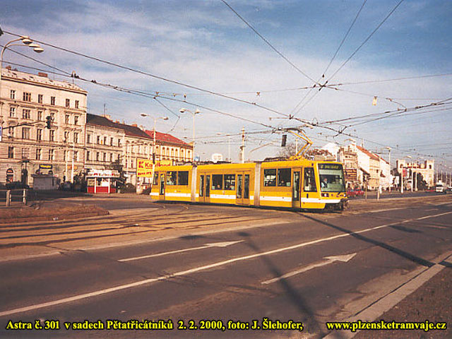 "plzeňském" nátěru, narozdíl od třistajedničky, která je ve dvou odstínech žluté. Na fotografiích z ledna 2000 projíždí centrem Plzně (vlevo 302 u Hlavního nádraží, vpravo 303 vyjíždějící ze Zbrojnické ulice).