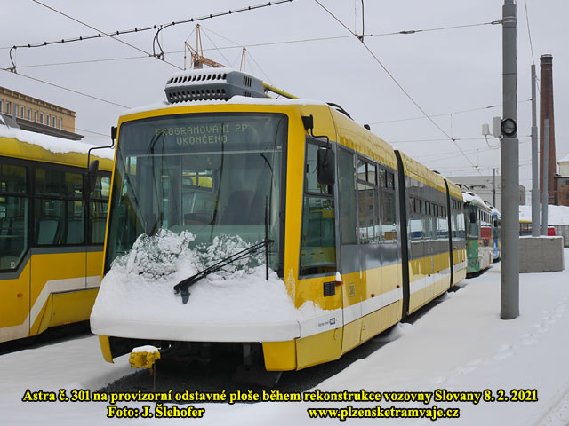 Po dlouhé odstávce (naposledy v provozu 27. 11. 2020) vyjíždí tramvaj Astra č. 301 na cvičnou a zároveň zkušební jízdu 10. 3. 2021.