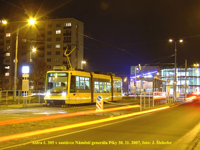 Vůz č. 303 ukončil provoz tramvají Astra v Plzni při svém zátahu z osmého pořadí krátce před půlnocí. Zde na snímku ještě vpravo v sadech Pětatřicátníků při posledním svém "křižování".