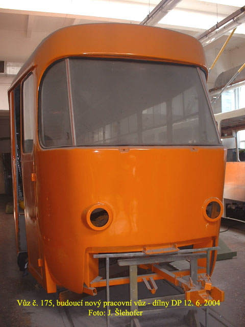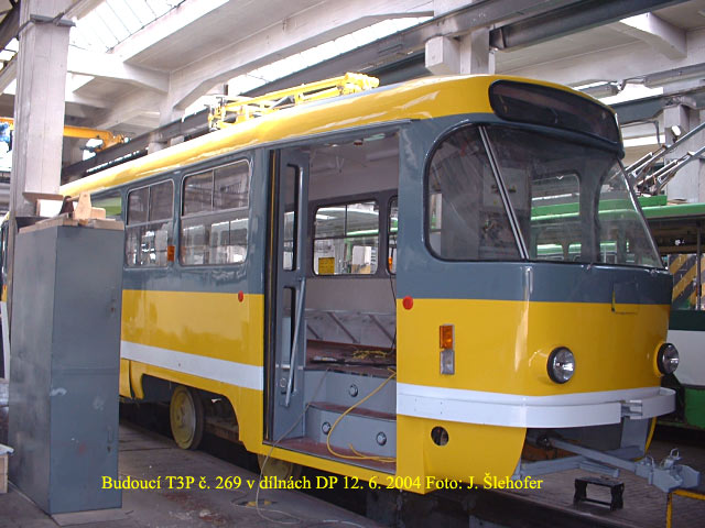 Rozpracovaný vůz č. 269 v dílnách v Cukrovarské ulici 12. 6. 2004 Budoucí pracovní vůz v dílnách v Cukrovarské ulici 12. 6. 2004 V areálu v Cukrovarské ulici bylo možné si kromě vozovny trolejbusů a autobusů prohlédnout i dílny dopravního podniku, kde se provádí težká údržba a modernizace tramvají a trolejbusů. Z tramvají zde byly rozpracované budoucí vozy T3P č. 233+234, 269 a také budoucí kolejový brus s původním číslem 175.