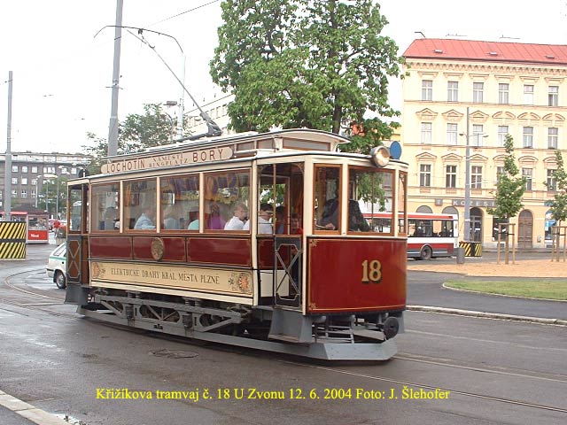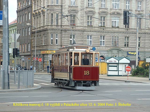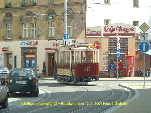 Křižíkova tramvaj č. 18 v Palackého ulice po rekonstrukci - 12. 6. 2004 Křižíkova tramvaj č. 18 vyjíždí z Palackého ulice - 12. 6. 2004 Křižíkova tramvaj č. 18 projíždí kolem tzv pískoviště U Zvonu - 12. 6. 2004 Tramvaj T1 č. 121 nasazená na lince D1 pro návoz návštěvnků na den otevřených dveří v DP - sady Pětatřicátníků - 12. 6. 2004