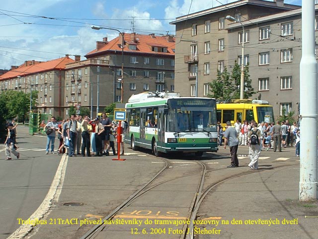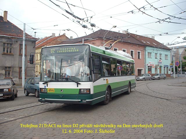 Trolejbus 21TrACI č. 484 přiváží další návštěvníky do vozovny Cukrovarská 12. 6. 2004 Trolejbus právě přivezl další návštěvníky na den otevřených dveří do tramvajové vozovny Slovany 12. 1. 2004 Mezi oběma vozovnami projížděla linka D2, na které byly nasazeny dvě Trejsiny (trolejbusy 21TrACI). Ty mezi náměstím Milady Horákové a vozovnou Slovany (včetně), jely mimo trolejové vedení, tedy na pomocný agregát.