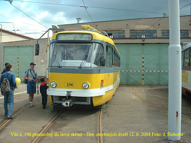 Astra č. 301 sloužila při dni otevřených dveří jako výdejna propagačních předmětů - 12. 6. 2004 Vůz č. 196 po výměně skříně Na Slovanech byly vystavené jednotlivé typy tramvají. Mezi zajímavé vystavené vozy patřily vůz č. 196, tedy T3P s novou skříní, či prototypová Astra č. 300, která po rozsáhlé opravě u výrobce obdržela městský žlutošedý nátěr (původně byla v modrém nátěru). Dále si návštěvnící mohli prohlédnout areál vozovny včetně měnírny. Za svůj zájem obdrželi drobné propagační materiály, případně si mohli zakoupit právě vydaný jízdní řád MHD, či publikaci vydanou ke stopátému výročí.