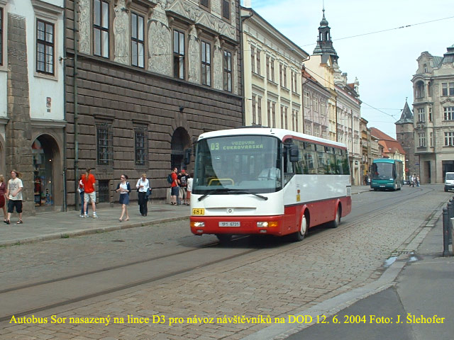 Prototyp trolejbusu Škoda 24Tr Irisbus při dni otevřených dveří 12. 6. 2004 Autobus Sor nasazený na lince D3 pro návoz návštěvníků na den otevřených dveří 12. 6. 2004 Do trolejbusové a autobusové vozovny v Cukrovarské ulici jezdila kromě zmiňované trolejbusové spojovací linky ještě linka autobusová, vedoucí ze sadů Pětatřicátníků, označená D3. Nasazeny na ní byla autobusy SOR (na fotografii je zachycen na náměstí Republiky). Interval měly stejně jako linka tramvajová 30 minut a obě linky jely v prokladu, takže ze sadů Pětatřicátníků jel na den otevřených dveří nějaký spoj v intervalu 15 minut. Na fotografii vpravo je pak prototyp trolejbusu Škoda 24Tr Irisbus vystavený v trolejbusové vozovně. Narozdíl od tramvaje Vektra, která se právě nacházela zpět u výrobce.