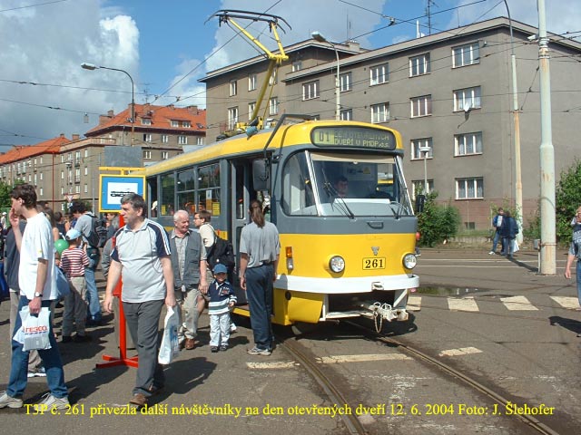 Historická tramvaj T1 č. 121 v sadech Pětatřicátníků na zvláštní lince D1 pro odvoz návštěvníků na Den otevřených dveří 12. 6. 2004 Modernizovaná tramvaj T3P č. 261 přivezla další návštěvníky na Den otevřených dveří do vozovny Slovany 12. 6. 2004 V sobotu 12. 6. 2004 uspořádaly Plzeňské městské dopravní podniky a. s. u příležitosti stopátého výročí od zahájení provozu městské hromadné dopravy v Plzni den otevřených dveří ve svých vozovnách. K návštěvě mohli cestující zdarma využít zvláštních linek. Ze sadů Pětatřicátníků do tramvajové vozovny Slovany byla vedena tramvajová linka D1. Nasazen na ní byl vůz T3P č. 261 a historický vůz T1 č. 121.
