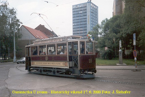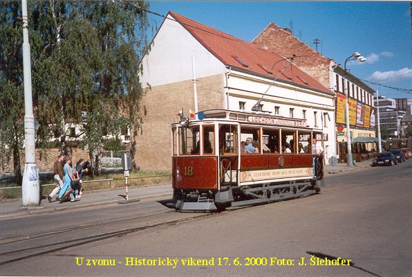 točně U zvonu. Letos už stojedna let stará Křižíkova tramvaj č. 18, která jako první