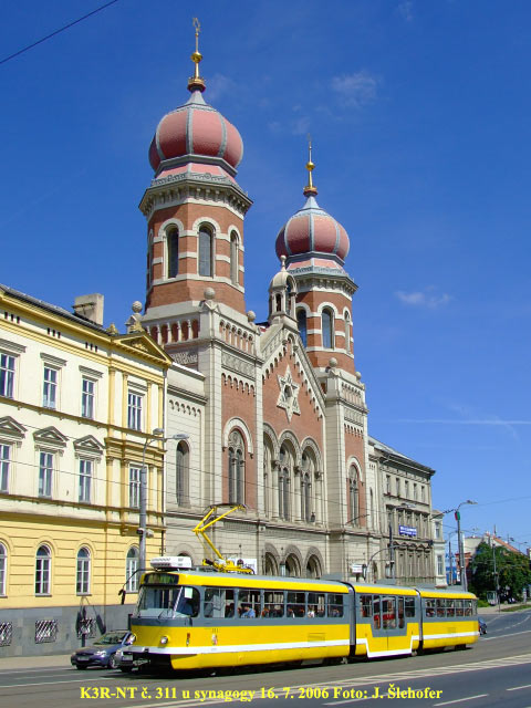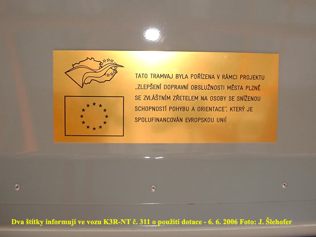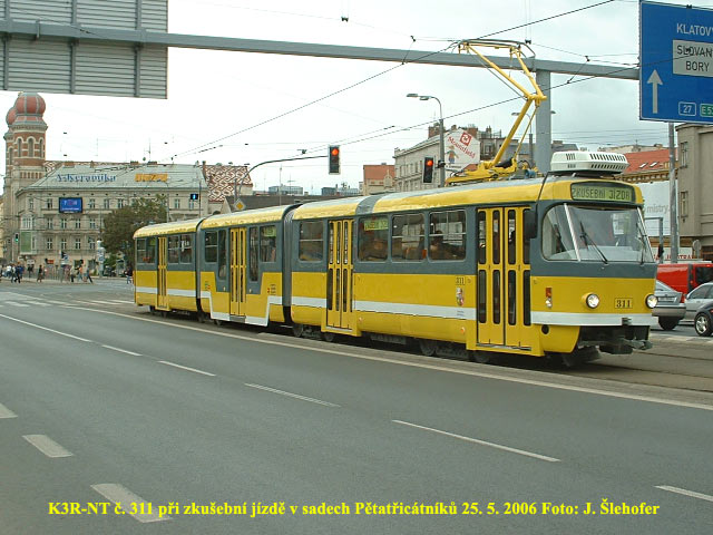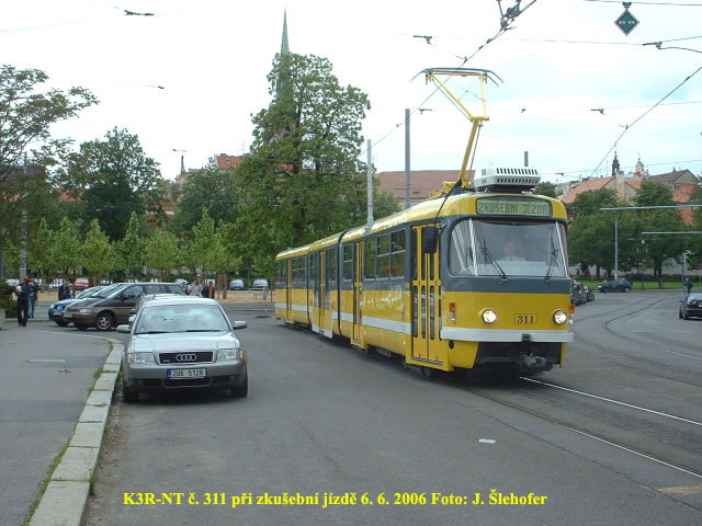 Na těchto fotografiích je zachycen vůz č. 311 při první zkušební jízdě do města dne 25. 5. 2006. Pro nás plzeňáky zajímavě netypicky působí i plenty překrývající podvozky