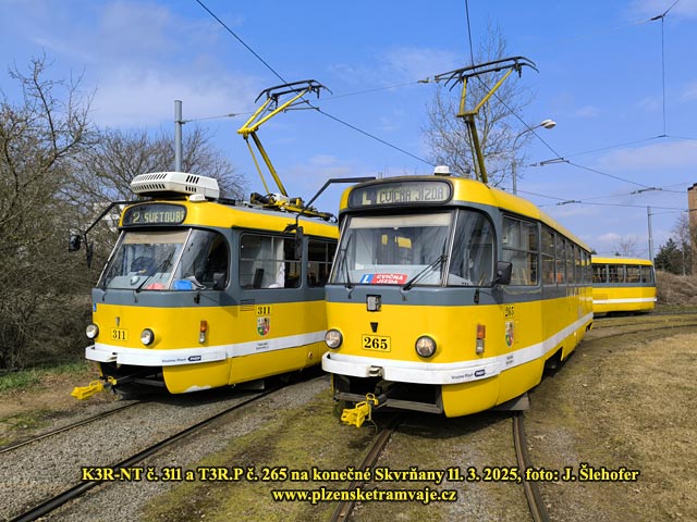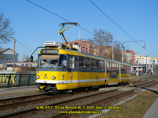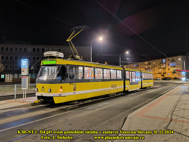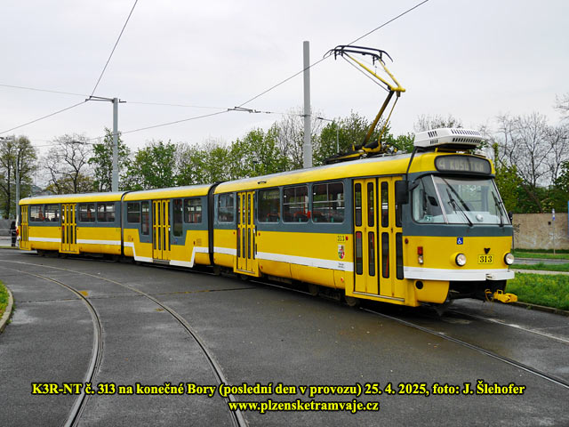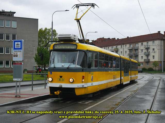 Na šejdrovém pořadí 21 linky č. 4 byla dne 25. 4. 2025 naposledy nasazena v pravidelném provozu tramvaj K3R-NT č. 313. Na snímku vpravo je zachycena v zastávce Vozovna Slovany při návratu do vozovny. V té době zbývá v provozu již pouze poslední vůz (č. 311) tohoto typu a jeho provoz také brzy skončí.