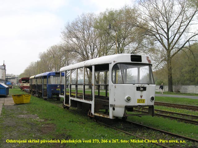 (č. 266+267 a 272+273), které budou přestavěny na další dva vozy K3R-NT. Na prvních dvou fotografiích z května 2006 jsou zachyceny odstrojené skříně vozů č. 273, 266 a 267.