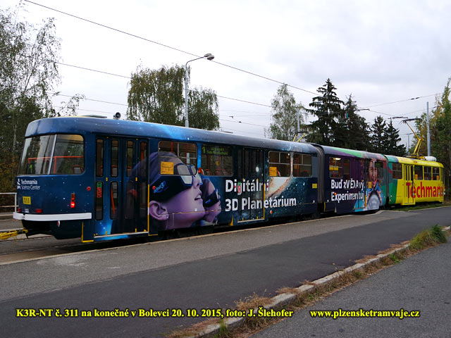 Krátce po velké prohlídce na podzim 2015 dostal vůz č. 311 reklamu Techmania. Přední článek je ve žluté barvě a přes zelený střed pak přechází do tmavě modré oblohy