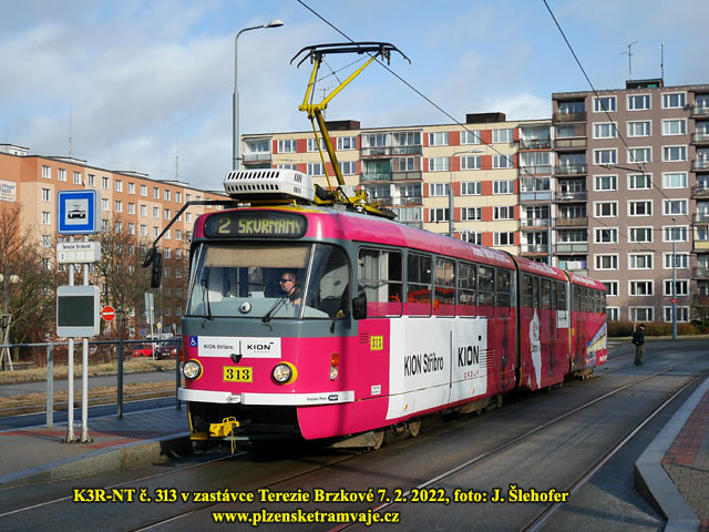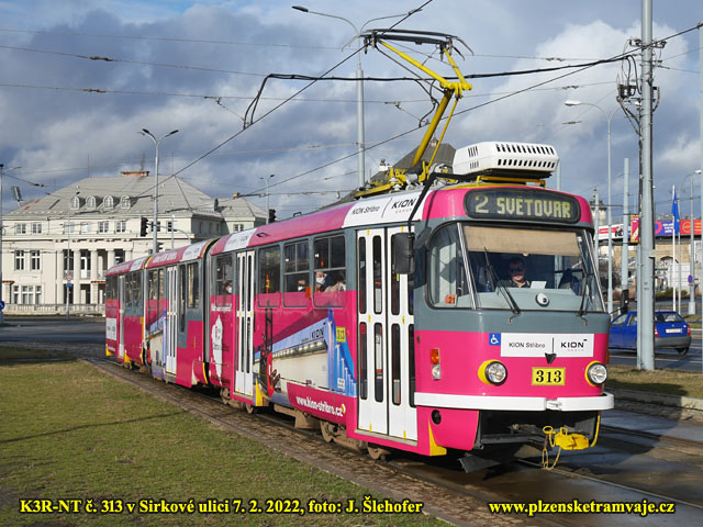 Na odpolední šejdr linky č. 2 vyjíždí 7. 2. 2022 porvé K3R-NT č. 313 s celovozovou reklamou firmy Kion Stříbro. Převládá růžová barva a celkové provedení není úplně povedené. Místy reklama působí jako nedodělaná. Vůz v této podobě jezdí až do října 2024, pak je po sloupání v obvyklé žluté barvě.