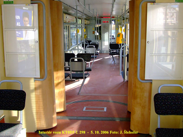 boxy pro reklamní letáky. Naninstalovány byly u kloubového spojení a v krajních článcích vedle trojkřídlích dveří. Patrné jsou i na fotografii vlevo, zachycující interiér tramvaje č. 298.