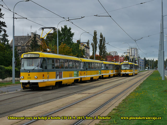 O víkendu a mimo dopravní špičky zůstávají nevyužité tramvaje mimo konečných také na odstavné koleji u hotelu CD na Karlovarské třídě.