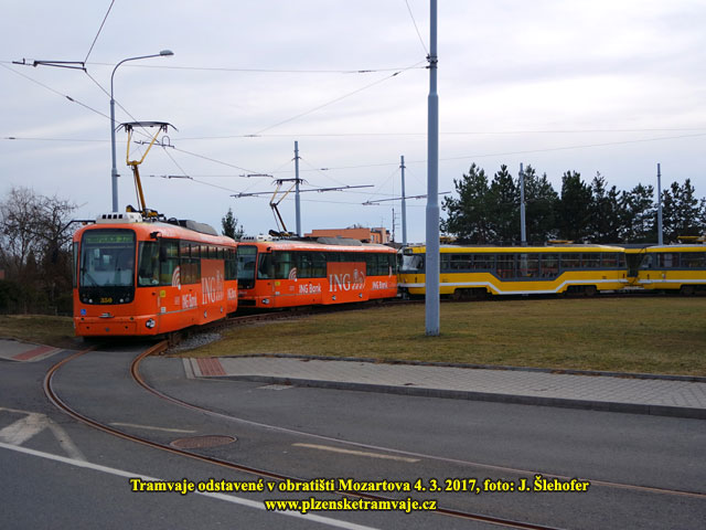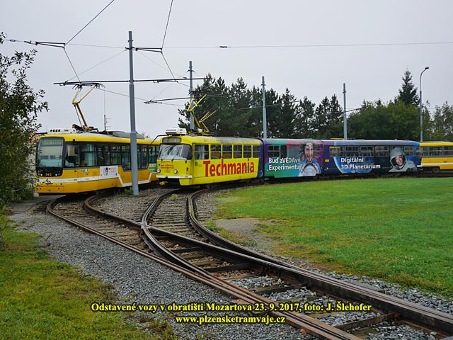 na odstavné koleji u hotelu CD, v obratišti U Zvonu a záložní soupravy také v Mozartově ulici.